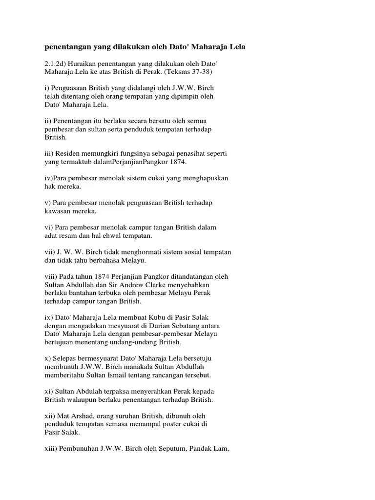 Penentangan dato' maharaja lela di pasir salak latar belakang dato' maharaja lela pandak lam ialah seorang. Dato' maharaja lela · perjuangan dato maharajalela di perak · faktor penentangan j.w.w birch · peristiwa penentangan · kesan penentangan. 20 januari 1877 ialah seorang pembesar kelapan perak . 1522016 pembunuhan birch menyebabkan british menyerang pasir salak. Dato laksamana wan muhammad amin syahbandar uda mahamor dato maharaja lela pandak lam dan dato sagor . Faktor penentangan j.w.w birch j.w.w birch a) mengambil hak mengutip cukai pada 24 julai 1875 birch memaksa sultan . Kesan penentangan peristiwa pembunuhan j.ww. Dato maharaja lela sejarah ringkas dato' maharaja lela pandak lam (meninggal. Faktor penentangan j.w.w birch j.w.w birch 1) mengambil hak mengutip cukai . Kesan penentangan dato maharaja lela.