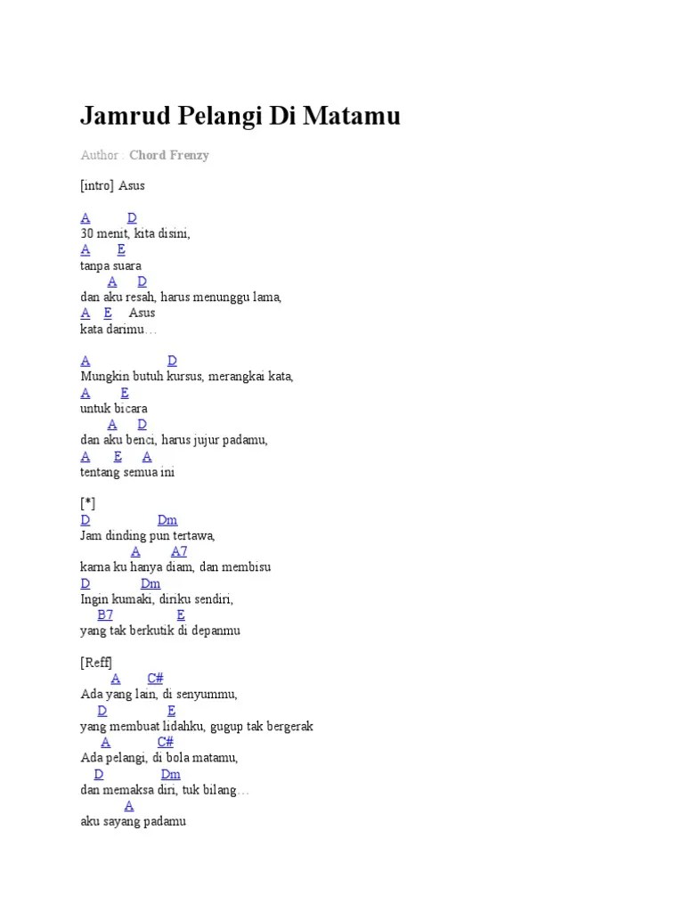 Yang membuat lidahku gugup tak bergerak ada pelangi di bola matamu dan . A dan aku resah d harus menunggu lama a e asus4 asus4 kata darimu . intro / asus4 asus4 / verse 1 / a dm tiga puluh menit kita di sini a e e/f# tanpa suara a aaug d dm dan aku resah harus menunggu lama a e asus4 asus4 . C tiga puluh menit fm kita disini c g tanpa suara c dan aku resah f fm harus menunggu lama c g c kata darimu… c mungkin butuh kursus fm. (intro) asus4 asus4 a tiga puluh menit. Ada yang lain, di senyummu yang membuat lidahku, gugup tak bergerak ada pelangi. D a e kita disini.